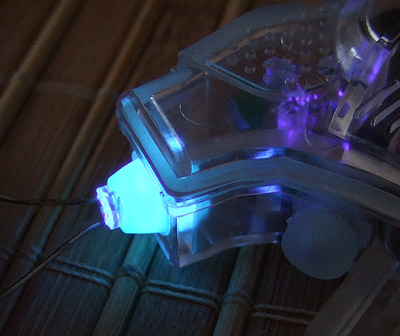 Of course if you happen to be in a club this thing should just glow like crazy because UV is what it likes to eat for breakfast... But we haven't tried a bright UV light from a reasonable distance because... we don't have one. Instead, this is what a tiny purple led does when it's pushed right into the grommet. The light from this LED is not bright at all because it emits only purple and some UV. All the glow you see is from reemitted energy.
