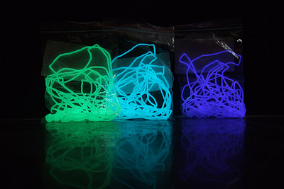 Now, you all know the yellow-green color, this is what's been used for the past decade in all manner of toys and emergency signs. However there was a breakthrough a few years ago when a better compound was discovered that glows much brighter and for a longer time. So if you've played with some glow in the dark toy a while ago you may be surprised. When this pigment is fully charged and taken to a dark room it glows as strong as those glow sticks. The benefit of using this color is that it's the brightest and fastest charging (and longest lasting). However it's not so sexy just because it's been overused.